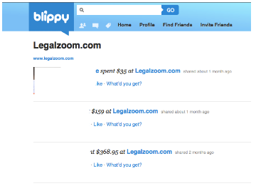 You may think that this problem is far fetched — but increasingly, consumers are using credit cards to pay for legal services. In fact, take a look at what I uncovered on Blippy: consumers reporting their purchase of legal documents at LegalZoom [photos & identifying information redacted]. Can disclosure of credit card fees to lawyers be far behind? If so, as lawyers, we owe an obligation to clients warn them of the repercussions of oversharing – whether it comes through sending our emails to opposing counsel, or revealing their transactions with their lawyers on sites like Blippy.