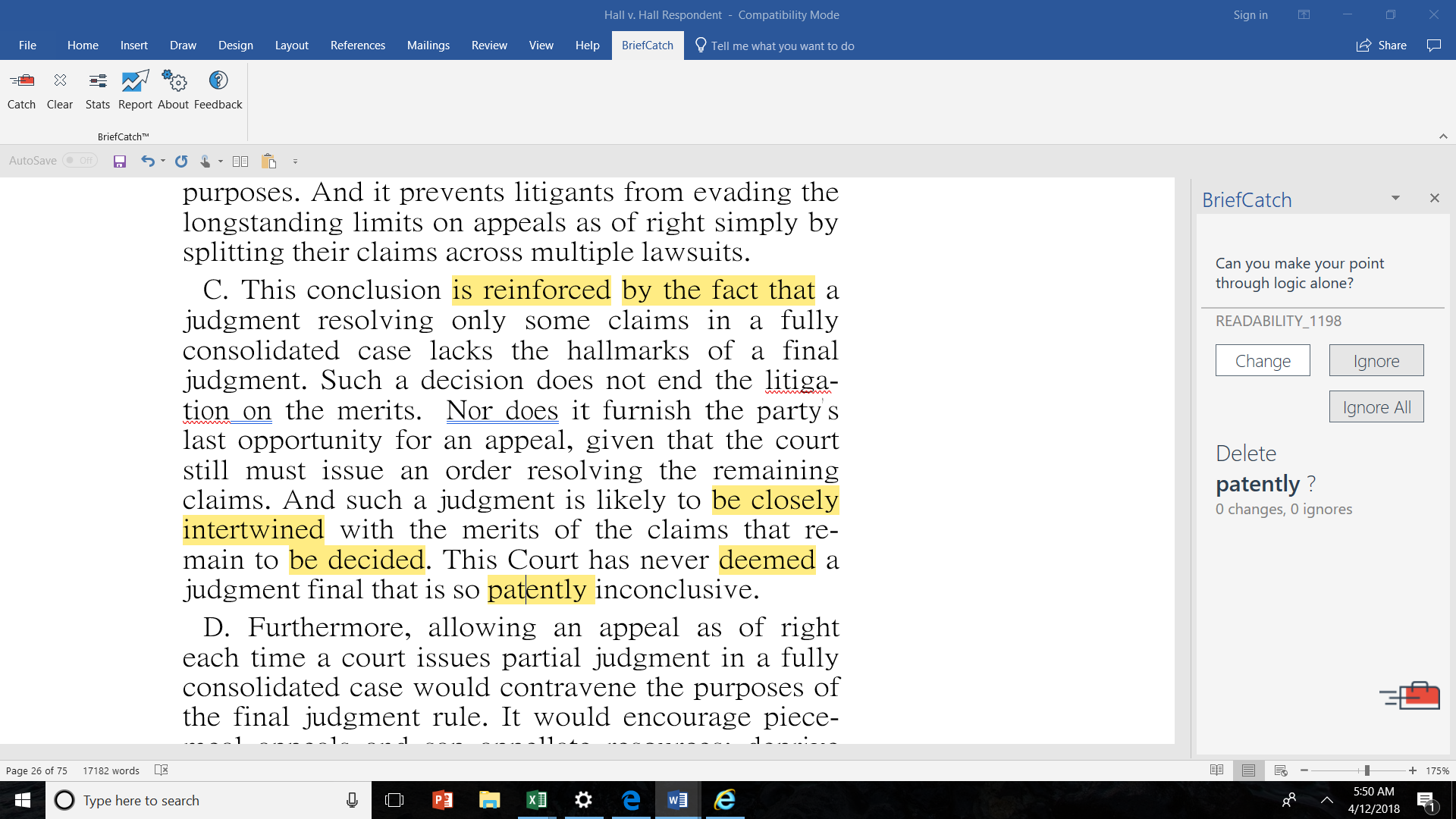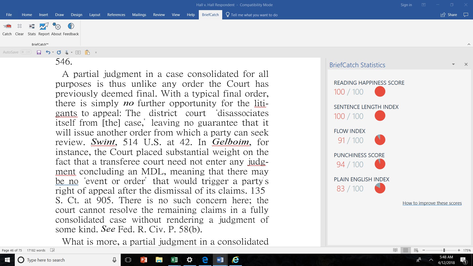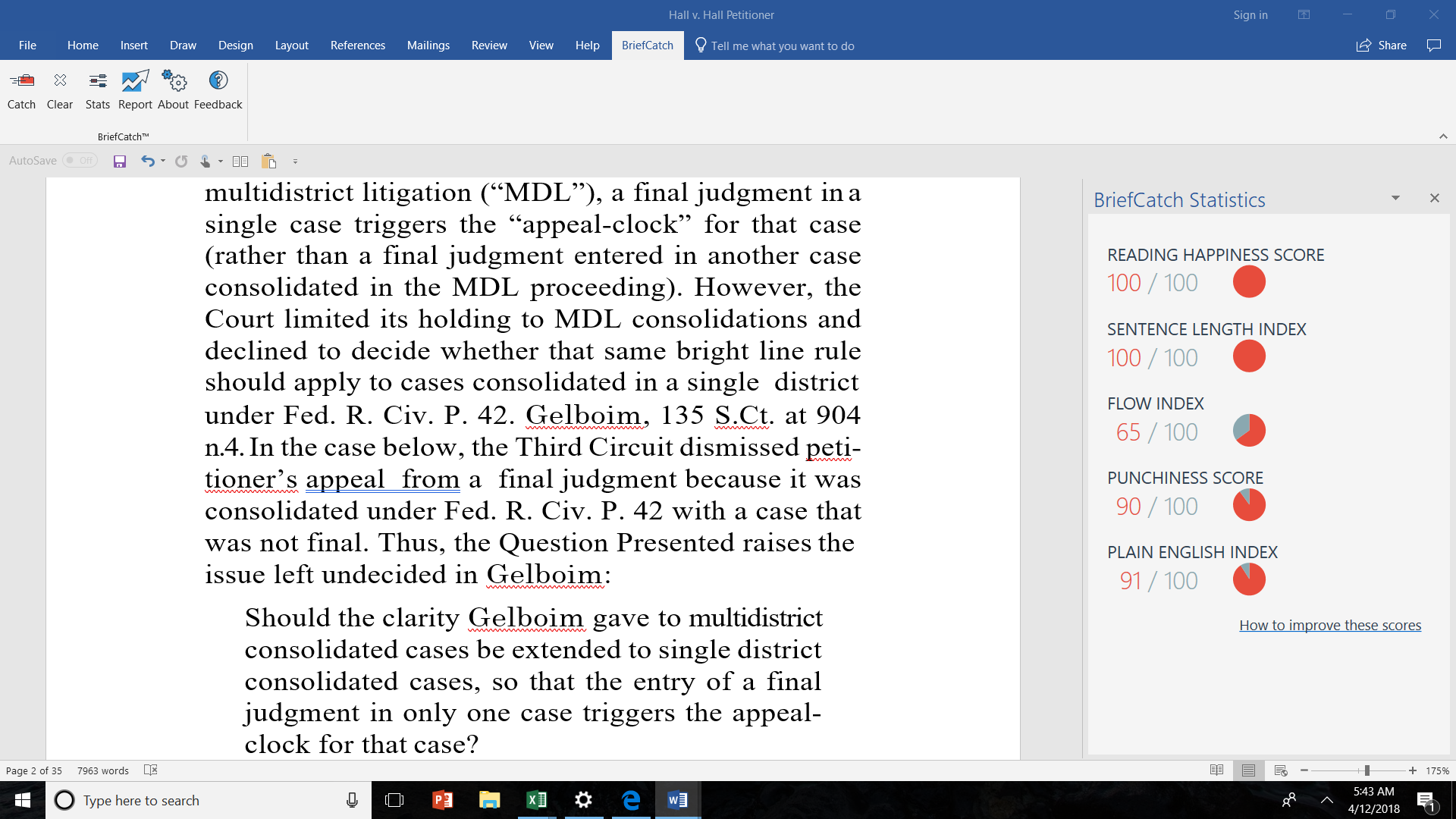 Below is an example of how BriefCatch works in action, using the briefs in the recent Supreme Court decision in Hall v. Hall as an example because it’s a modern-day Cinderella story of a solo lawyer pulling out a 9-0 victory at the court. As a bonus, the Petitioner was represented by one of my friend and colleague, Andy Simpson — also MyShingle’s first Shingular Sensation — while the Respondents were represented by Neil Katyal of Hogan Lovells, a firm that I’ve gone up against many times and dependably turns out some of the best legal writing around. If you’re interested in seeing the actual briefs, you can find them at SCOTUS Blog.