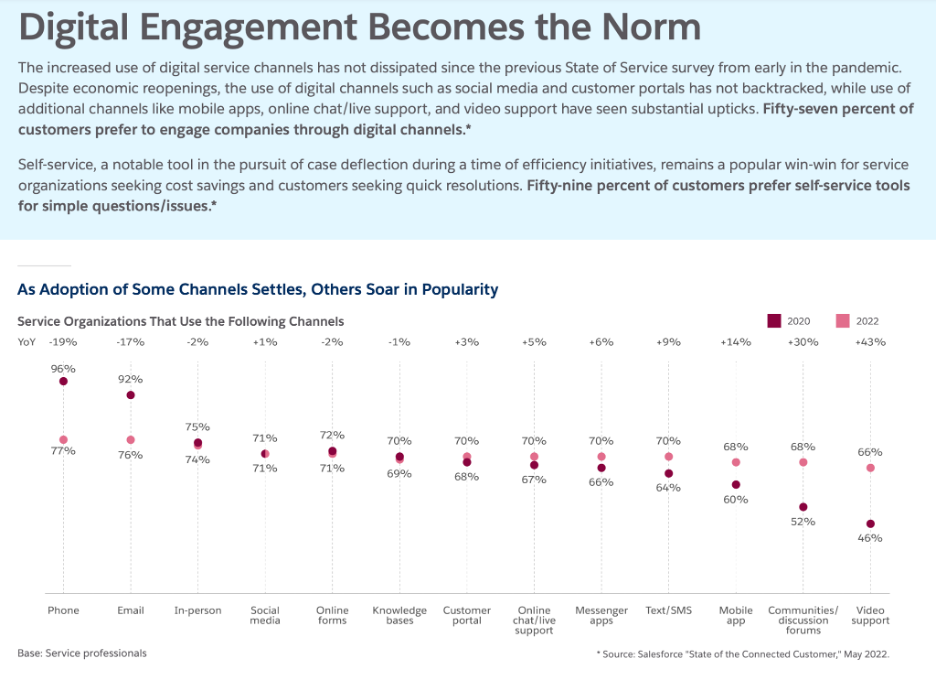 The chart above shows the engagement tools being used in the post-pandemic world. The number of companies using phone and email both have declined by roughly 15 percent. Meanwhile, 15 percent more companies are using video and community forums to engage customers in 2022 than back in 2020. Other channels – such as online forms, social media, and customer portals have remained the same. And while it’s tempting to chalk up the change in communication protocols to reduced workforce staff or the pandemic, it bears repeating that this type of interaction is preferred by 57 percent of customers.